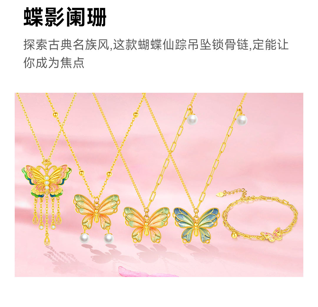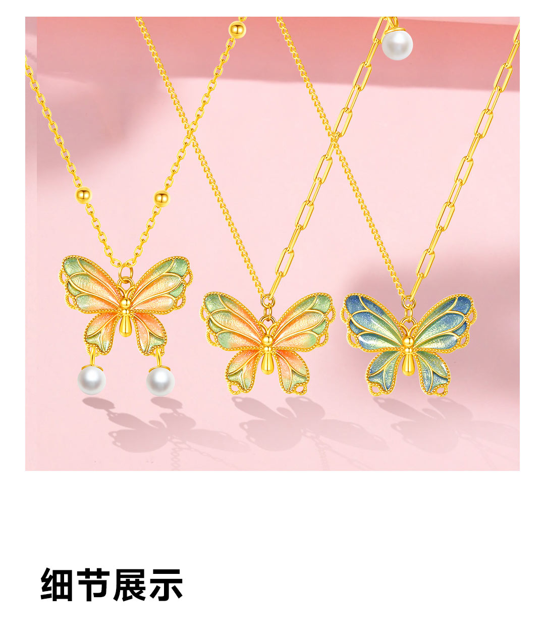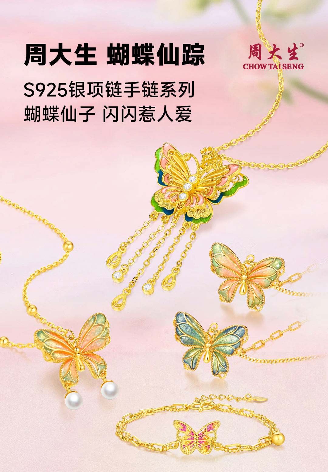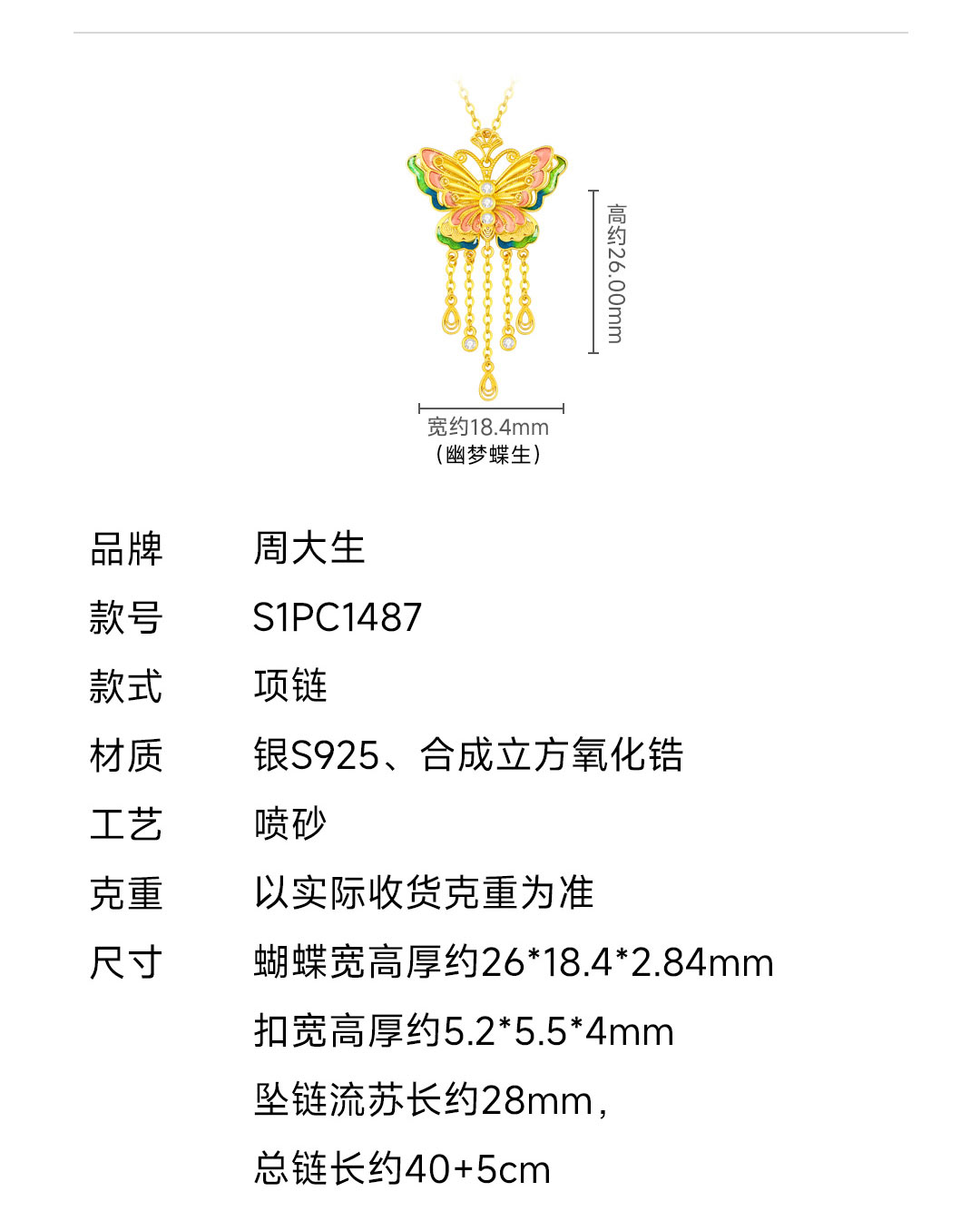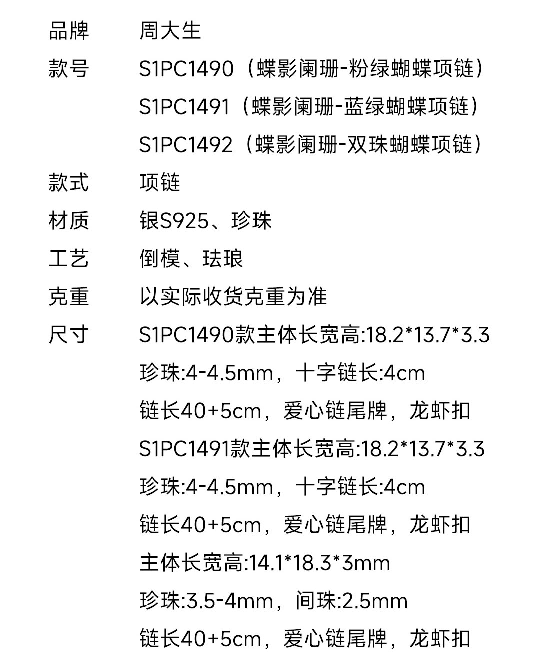 周大生 蝴蝶仙踪银项链手链系列 蝶影阑珊-粉绿蝴蝶项链 S1PC1490
