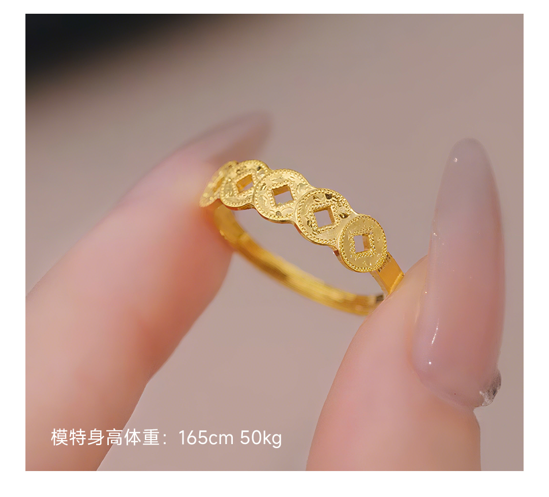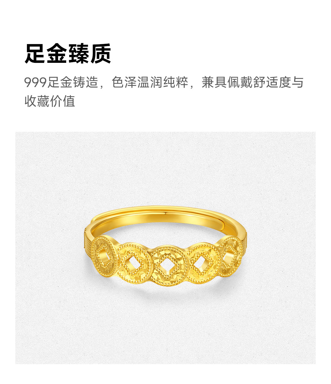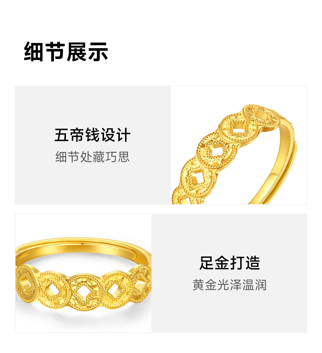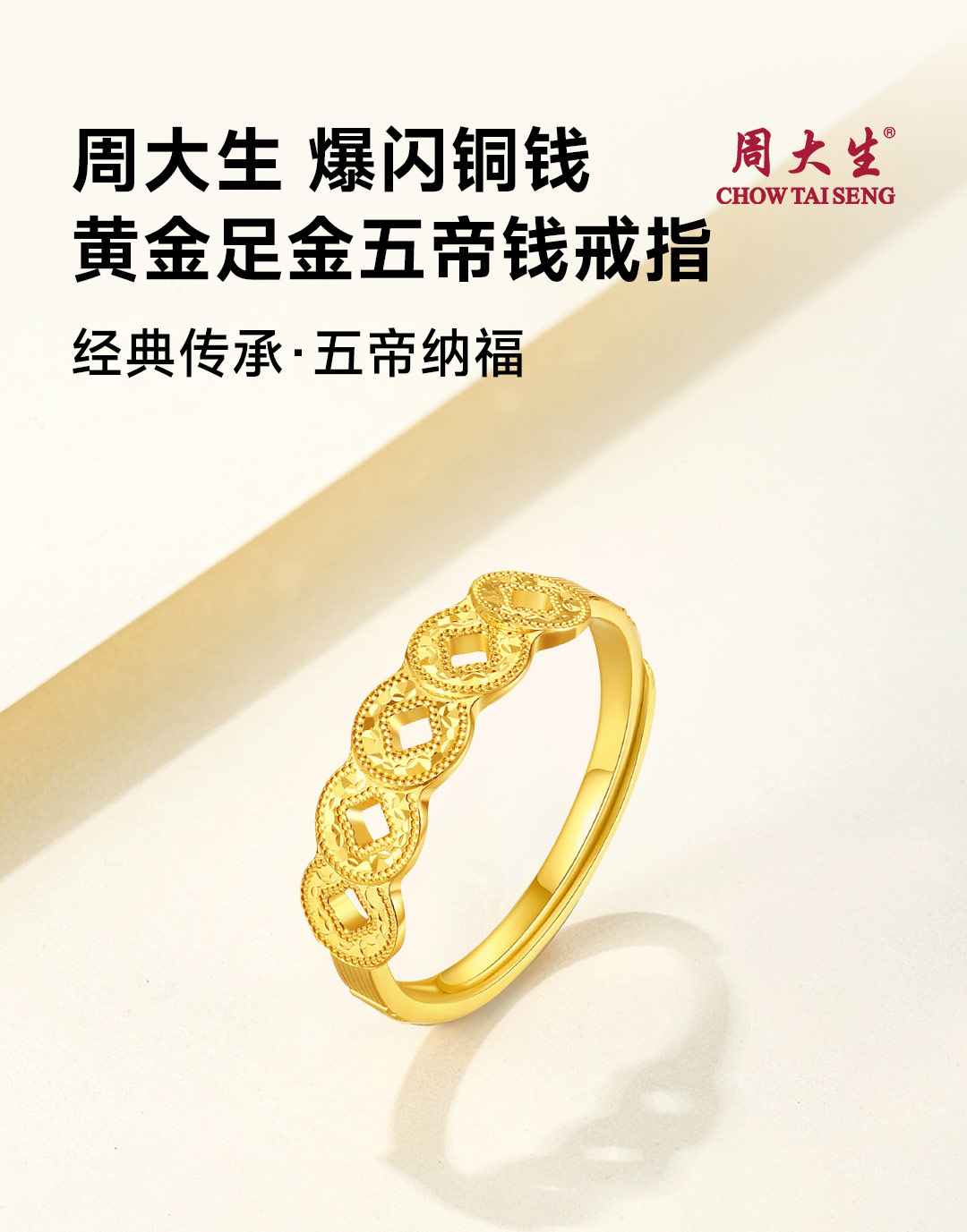 周大生 五帝币 足金黄金爆闪铜钱可调节戒指 五帝币戒指 约2.62g G1W3000478H