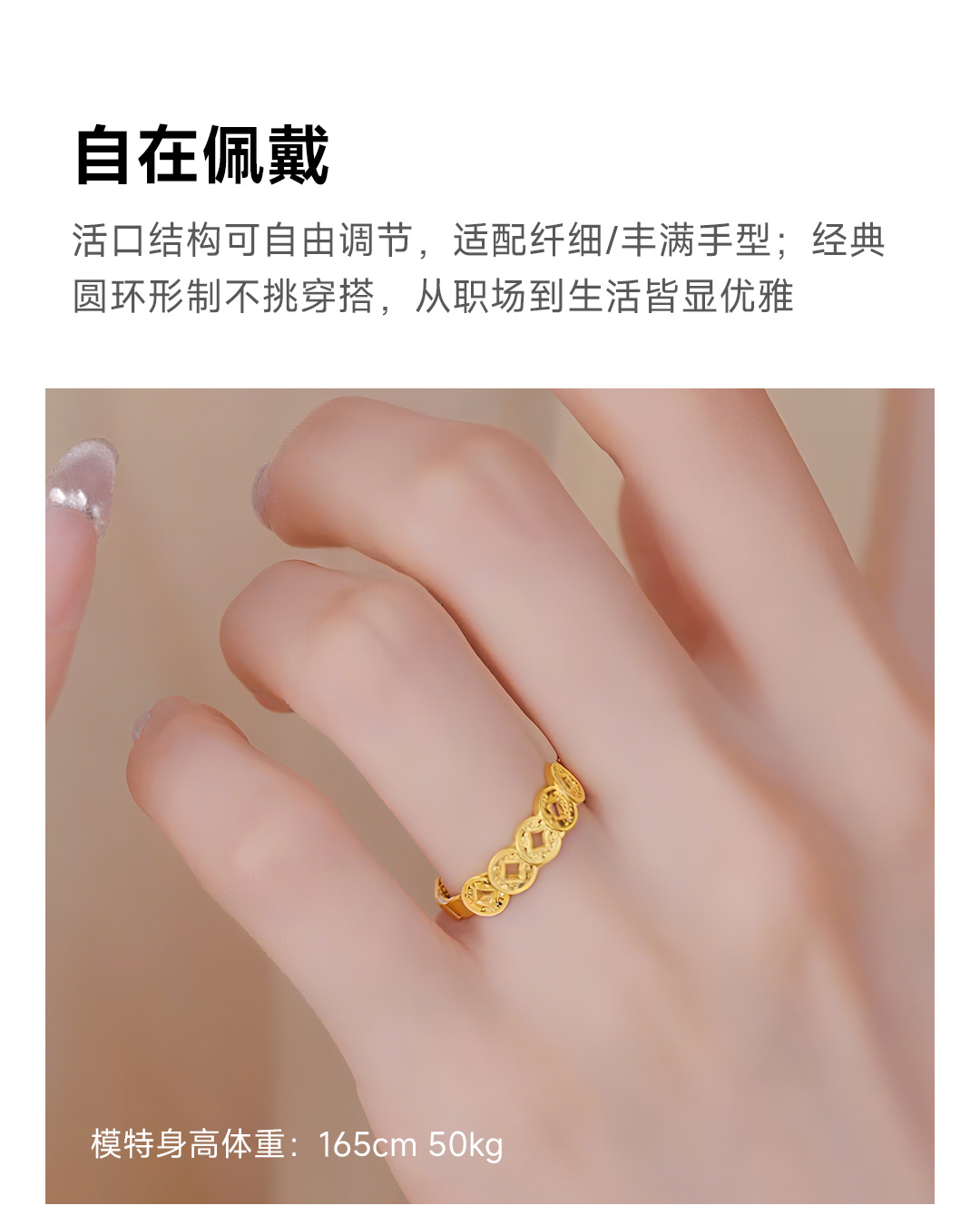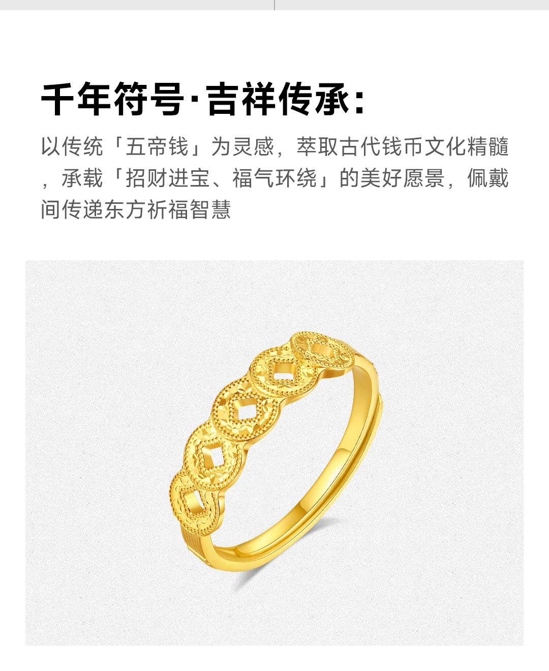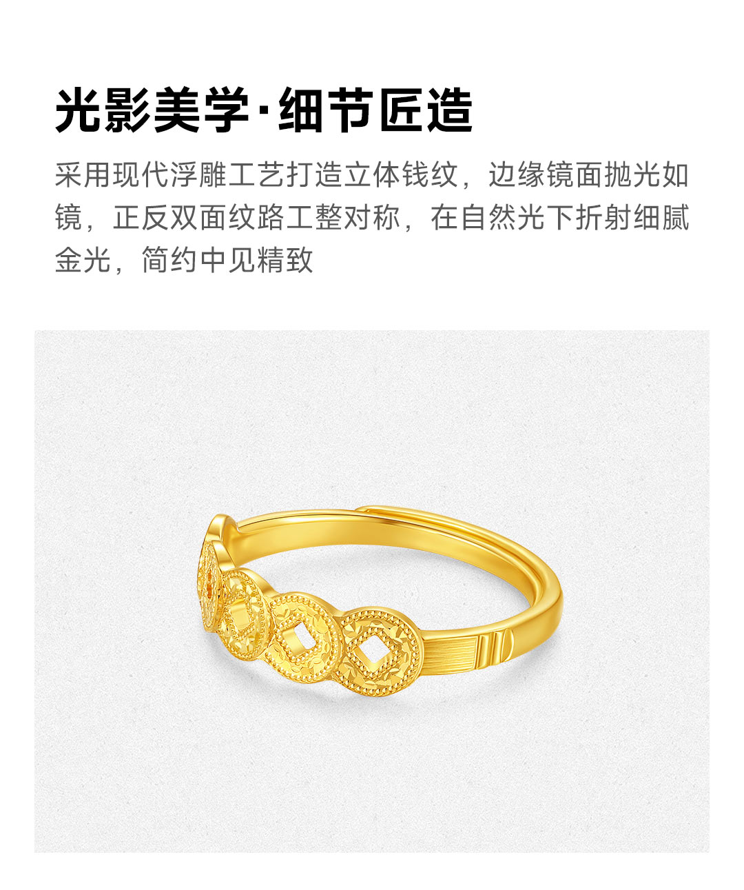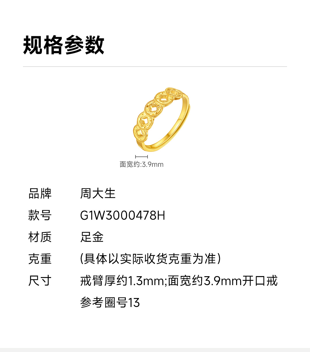 周大生 五帝币 足金黄金爆闪铜钱可调节戒指 五帝币戒指 约2.62g G1W3000478H