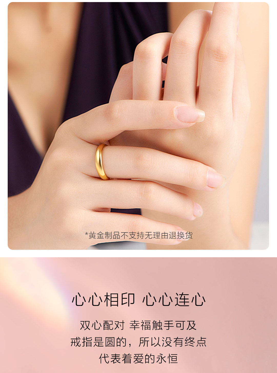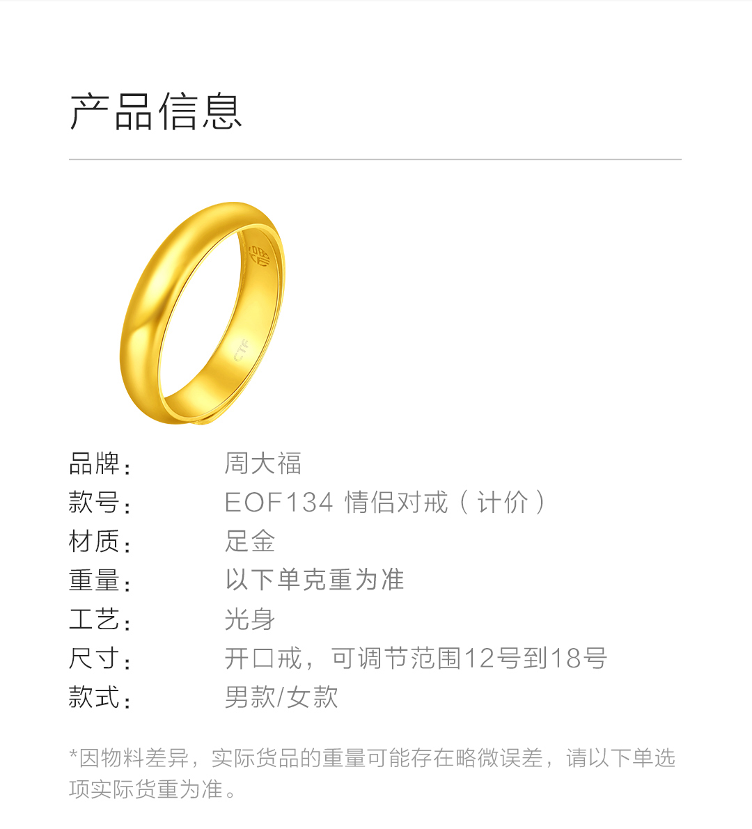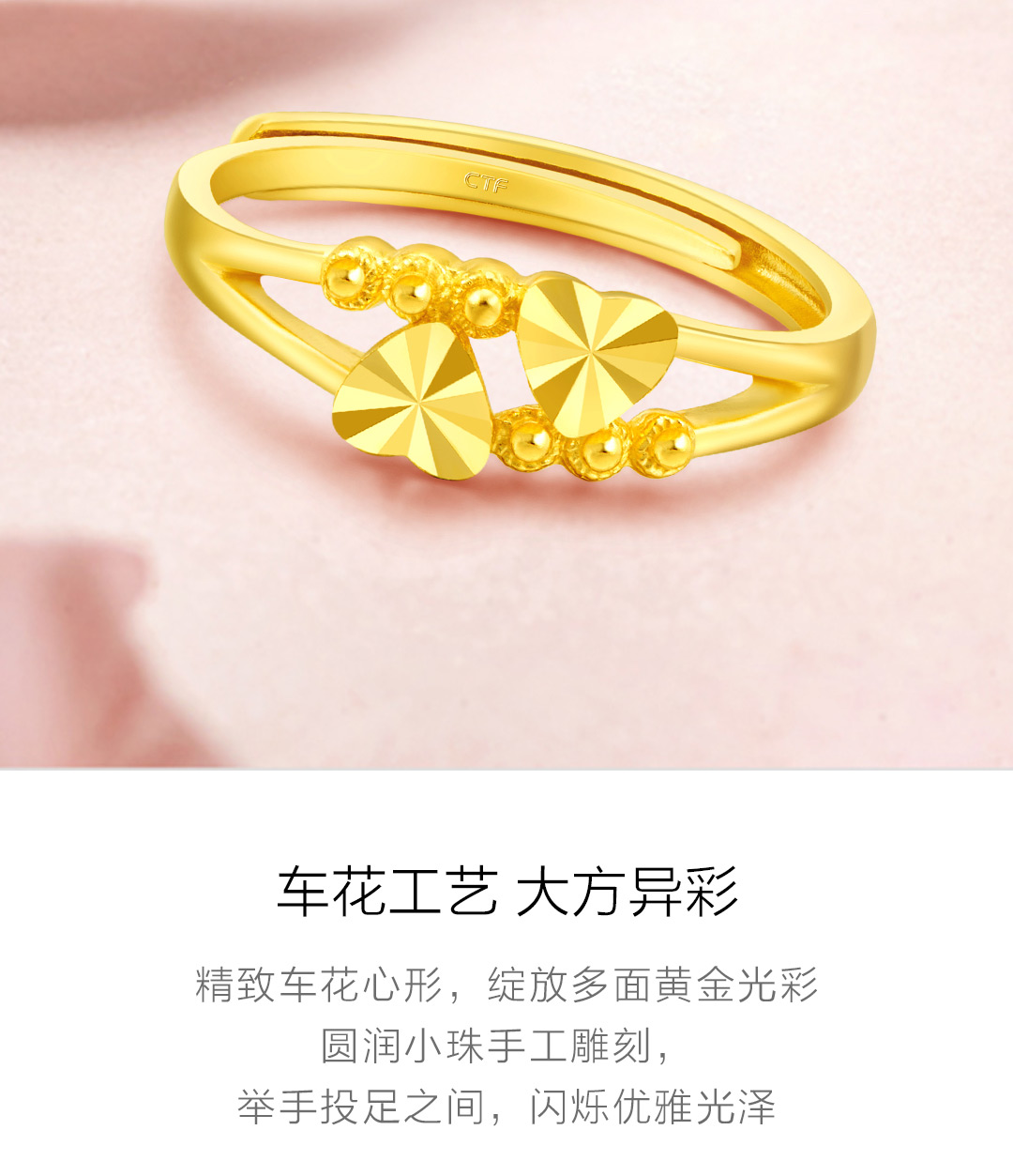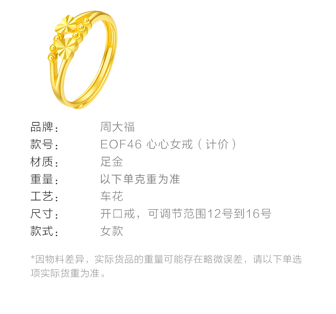 周大福 心心相印足金戒指情侣对戒礼物 EOF134-足金戒指(男女均适合,可调节戒圈)-工费180元-克重5.75g